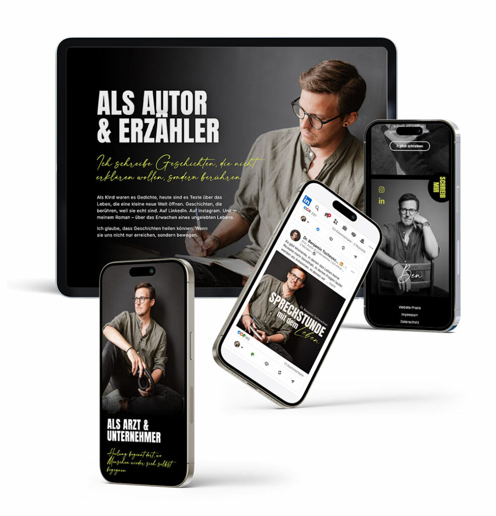 Dr. Benjamin Tscheuschner brauchte Personal Branding Bilder, die Haltung, Menschlichkeit und Klarheit zeigen Passend zu seiner Arbeit als Arzt, Psychotherapeut, Autor und Unternehmer. Eingesetzt in: